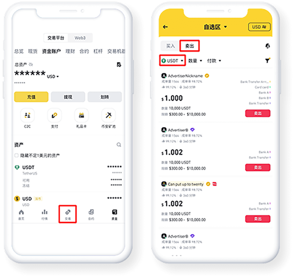 以USDT为例:打开币安APP首页,点击【交易】—【C2C】 —【卖出】— 输入【卖出数量】— 【卖出USDT】